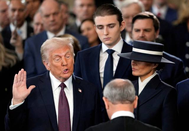 도널드 트럼프 미국 대통령이 20일(현지 시간) 워싱턴DC 의회 의사당 로툰다에서 제 47대 미국 대통령 취임 선서를 하고 있다. 4년 만에 백악관으로 화려하게 복귀한 트럼프 대통령이 집권 2기를 본격적으로 시작하면서 한반도를 비롯한 글로벌 안보 및 무역 질서가 대격변에 휩싸일 것으로 관측된다. AFP연합뉴스