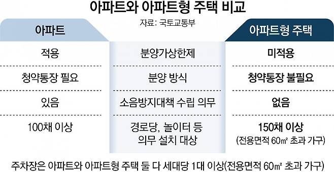 아파트형 주택에 들어서는 편의시설 기준은 강화된다. 지금까지 아파트형 주택은 아파트보다 느슨한 주차장 규정을 적용받아 세대당 0.6대 이상의 주차 공간만 확보했다. 앞으로는 전용면적 60㎡ 초과∼85㎡ 이하일 경우 세대당 1대 이상의 주차 공간을 마련해야 한다. 아파트형 주택의 고질적인 주차 문제가 일부 해소될 것으로 보인다.