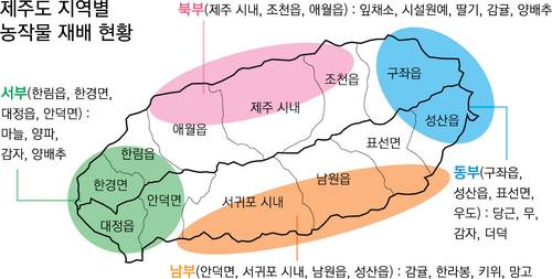 제주에서는 농부의 거주 지역에 따라 농작물의 종류가 결정된다. 화산지형인 제주는 토질이 지역별로 다른데, 그에 맞는 작물이 정해져 있다. 제주 남쪽인 효돈·위미·남원 등에선 노지감귤과 만감류를, 서쪽인 고산·대정·안덕에서는 양배추, 마늘, 양파 등을, 북부인 애월·조천 등에선 잎채소와 시설원예를, 동쪽인 김녕·구좌·성산에선 당근, 무, 감자 등 뿌리채소를 주로 한다.