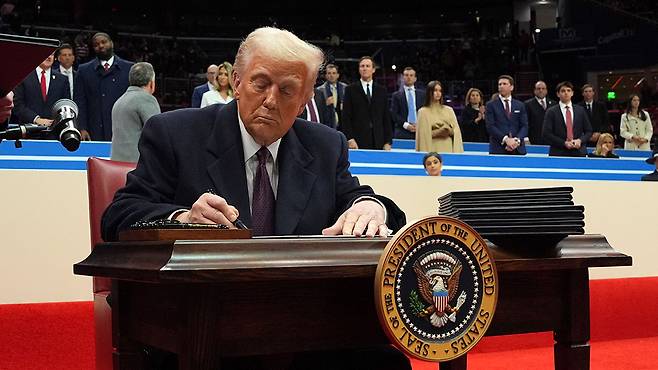 트럼프 대통령은 현지시간 20일 연방의회 의사당에서 취임식을 마친 후 지지자들이 모여있는 '캐피털원 아레나' 경기장을 찾아 지지자들의 박수를 받으면서 그 자리에서 행정명령에 서명했습니다.