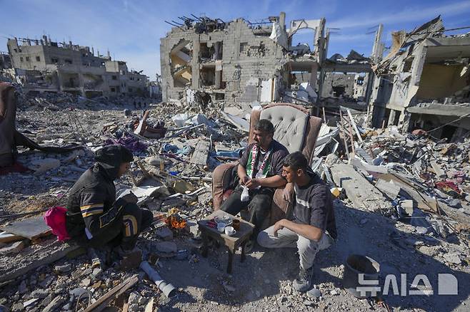 [라파=AP/뉴시스] 이스라엘과 하마스 간의 휴전 협정이 발효된 지 하루가 지난 20일(현지 시간) 가자지구 라파로 돌아온 팔레스타인 난민들이 파괴된 자택 잔해 위에 앉아 차를 마시고 있다. 2025.01.21.