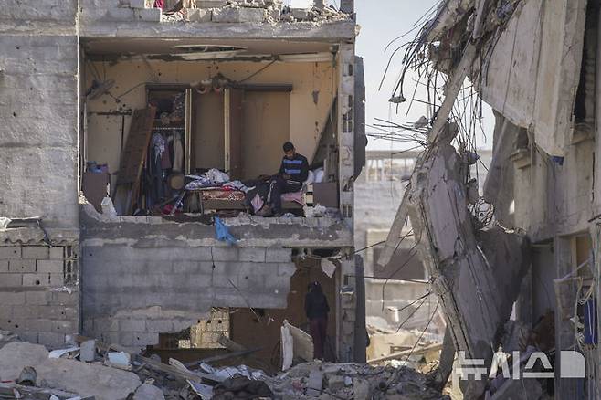 [라파=AP/뉴시스] 이스라엘과 하마스 간의 휴전 협정이 발효된 지 하루가 지난 20일(현지 시간) 가자지구 라파로 돌아온 한 팔레스타인 남성이 파괴된 자택 침실에 앉아 있다. 2025.01.21.