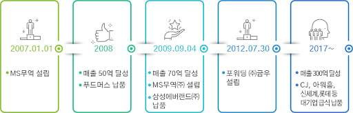 2009년 설립한 엠에스무역은 농산물을 수입해 식자재사들에 직접 유통을 하는 회사로 농산물 수입 및 검역, 물류, 유통 서비스를 제공한다. 특히 중국 농산물 수입 부문에서 업계 1위 지위에 오른 것으로 알려졌다. 회사의 주요 거래처는 식재료가 대규모로 필요한 단체급식업체이다. 회사는 아워홈, 삼성웰스토리, CJ프레시웨이 등 식수 100인 이상의 대규모 고객사를 보유하고 있다.