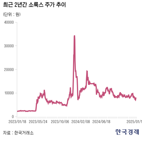 정 대표가 최대주주에 오른 뒤 소룩스 주가는 롤러코스터를 탔다. 2023년 초 2000원 초반대였던 소룩스 주가는 정 대표로 최대주주가 변경된 뒤인 같은 해 7월 1만원을 넘었다. 이후 다시 4000원대까지 밀렸던 주가는 2023년 말 소룩스가 1400% 무상증자를 결정하면서 3만4412원까지 상승했다.