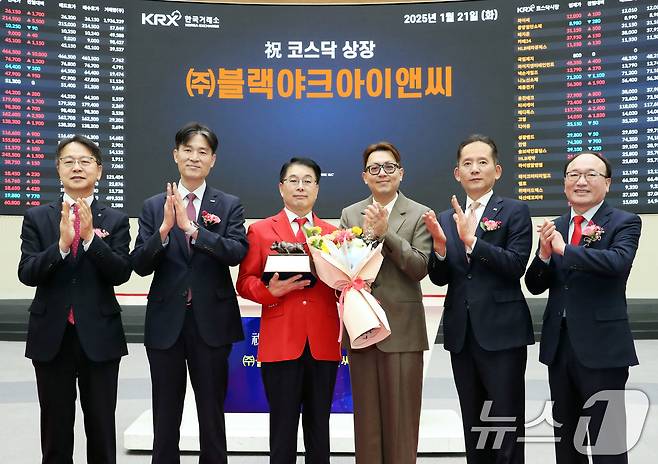 (서울=뉴스1) = 21일 오전 서울 영등포구 한국거래소에서 열린 '블랙야크아이앤씨 코스닥시장 상장기념식'에서 상장기념패 전달 후 김대영 한국IR협의회 부회장(왼쪽부터), 민경욱 한국거래소 코스닥시장본부장, 김태효 블랙야크아이앤씨 대표이사, 강준석 비와이엔블랙야크 사장, 강성범 미래에셋증권 부사장, 강왕락 코스닥협회 부회장이 기념촬영을 하고 있다. (한국거래소 제공) 2025.1.21/뉴스1