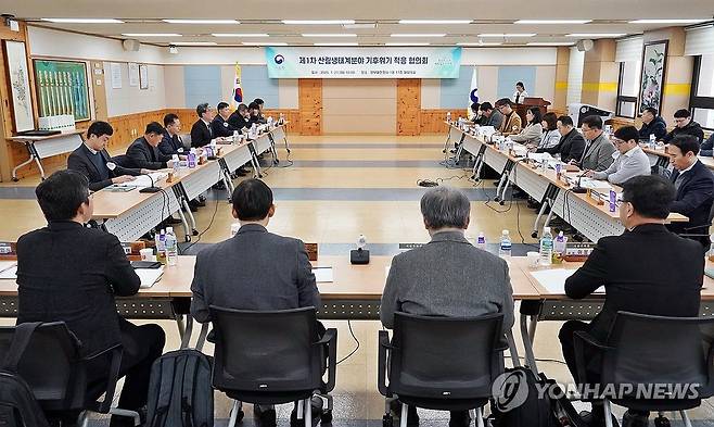 (대전=연합뉴스) 임상섭 산림청장(왼쪽 좌석 왼쪽 네 번째)이 21일 정부대전청사에서 기후변화에 따른 고산 침엽수 멸종 등에 대응하기 위한 '산림생태계 기후위기 적응 협의체' 위원 38명에게 위촉장을 주고 첫 회의를 주재하고 있다. 2025.1.21 [산림청 제공. 재판매 및 DB 금지]