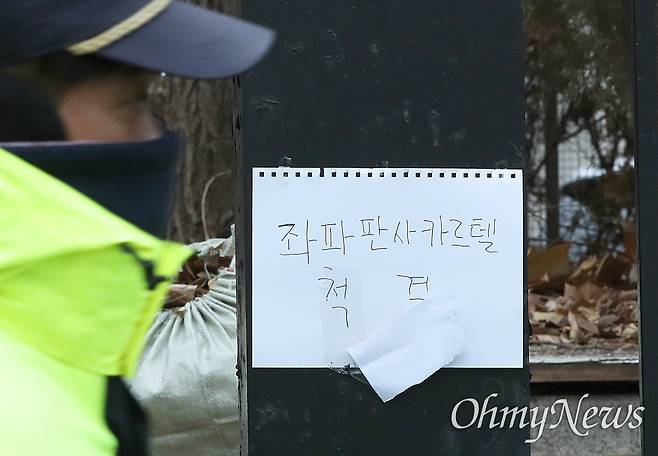 | ▲ 서부지법 담벼락에 붙어 있는 '좌파 판사 카르텔 척결' 윤석열 대통령이 19일 새벽 구속되자 윤 대통령 지지자들이 서울서부지방법원(서부지법)에 침입해 외벽을 부수고 유리창을 깨는 난동을 부려 법원 청사가 심하게 파손됐다. 사진은 이날 오전 서부지법 담벼락에 붙어 있는 피켓. '좌파 판사 카르텔 척결'이라고 적은 문구가 보인다. |