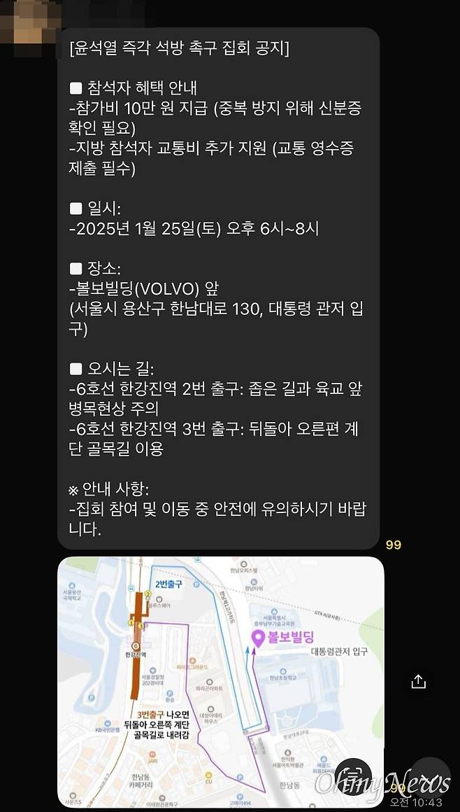 이 공지문에는 오는 25일 한남동 관저 앞 집회에 참석하는 이들에게 "신분증 확인"을 한 뒤 "참가비 10만 원"을 지급할 뿐만 아니라, 타 지역에서 오는 참석자의 경우 "교통비 추가 지원"을 하겠다는 내용이 담겨 있다.