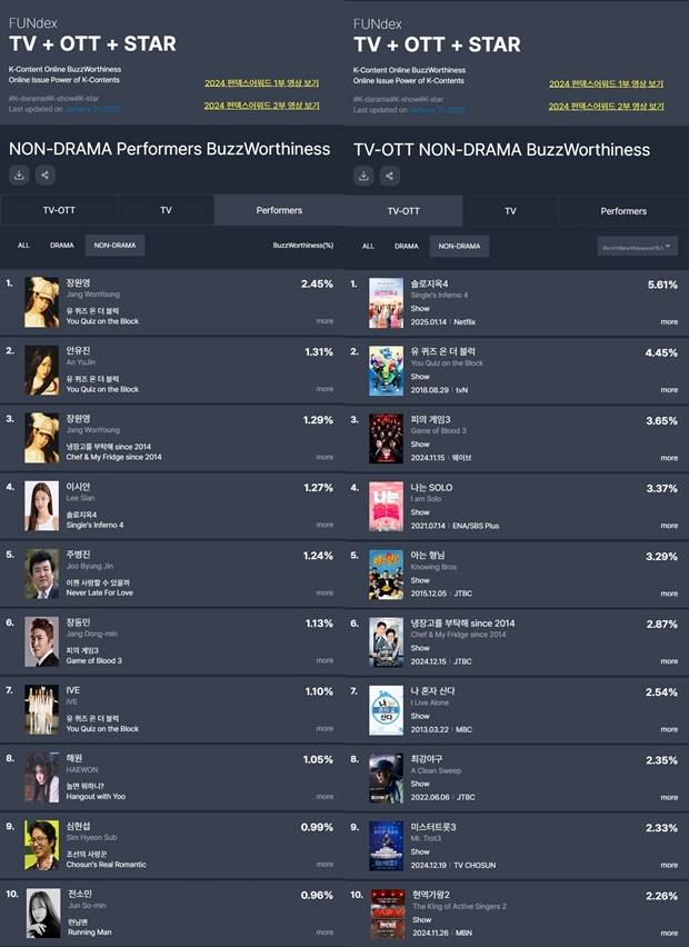 굿데이터코퍼레이션 펀덱스(FUNdex)에서 발표한 1월 3주차 TV-OTT 통합 비드라마 출연자 화제성 부문에서 tvN '유 퀴즈 온 더 블럭'에 출연한 아이브 장원영이 1위에 올랐다. 다양한 원영적 사고와 마음 다스리는 방법 등에 대해 말한 것이 화제가 된 것으로 분석됐다.