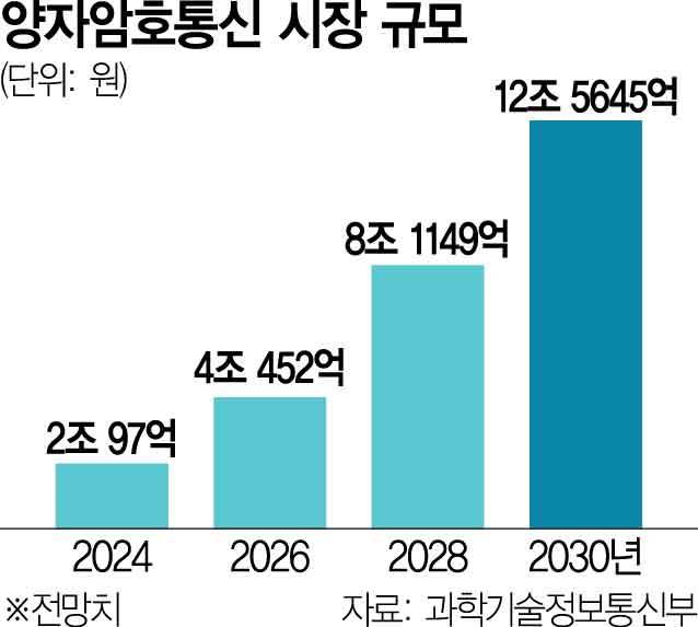 양자암호통신 시장은 양자기술 발전에 더해 특히 양자컴퓨터의 해킹 위협에 맞선 보안 업그레이드 수요에 힘입어 빠르게 성장 중이다. 과기정통부의 양자정보기술백서에 따르면 양자암호통신 시장은 연평균 34.2% 성장해 2030년 12조 5645억 원으로 커질 것으로 전망된다. 이 중 QKD가 대부분인 12조 1723억 원을 차지한다.