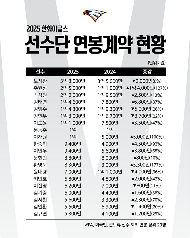 한화이글스는 21일 2025년 재계약자 59명 대상 연봉협상을 완료했다.