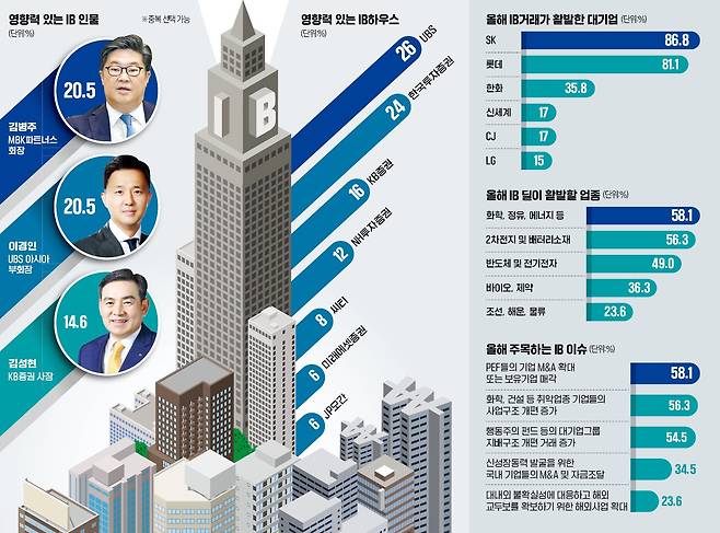 △강덕범 현대차증권 전무 △강민균 JKL파트너스 대표 △강성범 미래에셋증권 IB1부문 대표(부사장) △구성민 키움증권 기업금융부문 대표 △구재범 메리츠증권 본부장 △김상빈 한국투자프라이빗에쿼티 실장 △김성훈 유진투자증권 IB사업추진팀장 △김영호 IMM PE 대표 △김용환 맥쿼리 대표 △김의철 어피너티에쿼티파트너스 부대표 △김이동 삼정KPMG 딜부문 대표 △김재민 한앤컴퍼니 부사장 △김진우 한국투자프라이빗에쿼티 투자실장 △김태준 브레인자산운용 대표 △김해원 BofA증권 과장 △남상욱 딜로이트 파트너 △노승환 공무원연금공단 대체투자부장 △라민상 프랙시스캐피탈파트너스 대표 △문정운 iM증권 전무 △민준선 삼일회계법인 딜부문 대표 △박건영 브레인자산운용 사장 △박기수 스틱인베스트먼트 파트너 △박병규 JP모간 본부장 △박승근 큐리어스파트너스 대표 △박승인 케이스톤파트너스 상무 △박찬우 IMM크레딧솔루션 대표 △방한철 한국투자증권 상무 △변재철 IMM인베스트먼트 대표 △성주완 미래에셋증권 전무 △손광수 SK증권 부서장 △심민현 어펄마캐피탈 대표 △심종민 UBS 본부장 △연명필 SK증권 부장 △오세민 교보증권 ECM본부 본부장 △윤지선 MG새마을금고중앙회 자금운용부문장 △이경인 UBS 글로벌뱅킹부문 아시아 부회장 △이관훈 프랙시스캐피탈파트너스 공동대표 △이병익 상상인증권 전무 △이성 NH투자증권 IB1사업부 대표 △이승호 E&P PE 공동 대표 △이현규 대신증권 전무 △임채준 씨티그룹글로벌마켓증권 이사 △정근수 신한투자증권 CIB총괄사장 △정진곤 한국투자증권 IB4본부장 △정한설 캑터스프라이빗에쿼티 대표 △조학주 코스톤아시아 대표 △조한성 하나증권 기업금융 1실장 △조현재 JP모간 본부장 △주태영 KB증권 IB부문장 △한동규 유안타증권 팀장 △한민 씨티증권 상무 △황희연 큐캐피탈파트너스 대표 △삼성증권, 한국투자공사는 익명 요청. *설문 응답은 소속별 최대 두 명으로 제한했음.(가나다순)