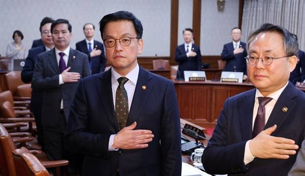 | ▲ 최상목 대통령 권한대행 부총리 겸 기획재정부 장관이 21일 정부서울청사에서 열린 국무회의에서 국기에 경례하고 있다. |