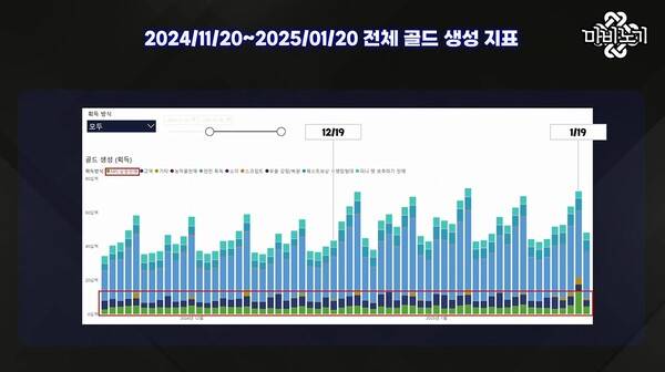 작년 11월 20일부터 1월 20일까지의 전 서버 골드 생성량과 NPC 상점 판매 비중도 공개했다. NPC 상점 판매 비중은 전체 골드 생성량에 비해 낮은 비중을 차지했으며, 해당 버그가 사용된 19일부터 급작스럽게 치솟았다.