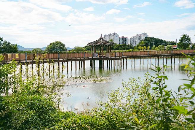 파란 하늘, 초록색 나무와 숲, 물이 있고, 데크로드 중앙에 정자도 있어 사진 스폿으로 활용할 만하다. 적당한 위치에서 인물을 가운데 두고 찍으면 그것만으로 충분하다. 아이와 함께라면 잔디밭에서 공놀이를 하는 것도 좋겠다. 중앙 분수대와 벽천분수 및 물놀이장도 이곳을 찾게 만드는 요소다.