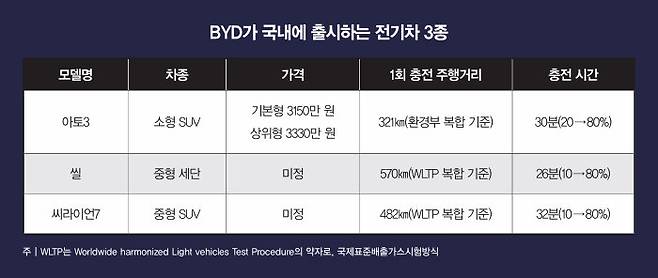 BYD는 국내 첫 출시 모델로 소형 전기 스포츠유틸리티차량(SUV) 아토3를 점찍고 1월 16일부터 사전 예약을 시작했다. 아토3는 2022년 출시 이후 100만 대 이상 팔린 BYD의 대표 모델이다. BYD는 아토3 출시를 위한 국내 인증 절차를 모두 완료한 상태다. 전기차 구매 보조금을 받는 데 필요한 한국환경공단의 전기차 보급 평가만 마무리되면 2월 중 차량 인도가 가능할 것으로 보인다.