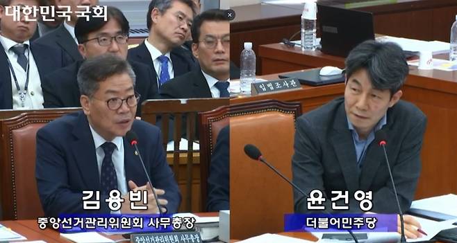 | ▲ 김용빈 사무총장과 윤건영 의원 작년 12월 23일 국회 행안위에서 질의 응답 중인 윤건영 의원과 김용빈 중앙선관위 사무총장 |