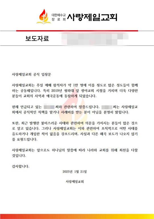 사랑제일교회 측은 입장문을 통해 “이 씨는 사랑제일교회에서 공식적인 직책을 맡거나 사례비를 받는 분이 아님을 분명히 밝힌다”며 “최근 발생한 불미스러운 사태와 관련해 의문을 가지시는 분들이 많은 것으로 알고 있지만 사랑제일교회는 이와 관련해 조직적으로 어떤 사태를 유도하거나 개입한 적이 없다”고 밝혔다.