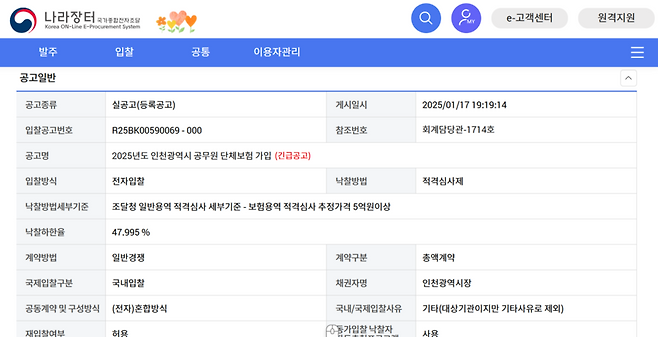 오늘(22일) 조달청과 인천광역시청에 따르면 이달 초부터 개통된 차세대 나라장터에 지난 17일 '2025년도 인천광역시 공무원 단체보험 가입' 긴급 입찰 공고가 올라왔습니다. 인천시 공무원들의 생명·상해, 질병수술비, 입원일당 등을 보장하는 보험으로 총 1만687명이 가입 대상입니다. 계약기간은 이달 11일부터 내후년 1월 10일까지입니다.