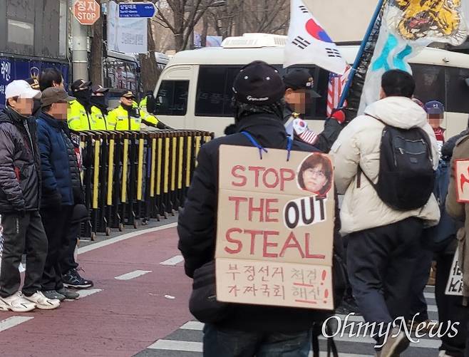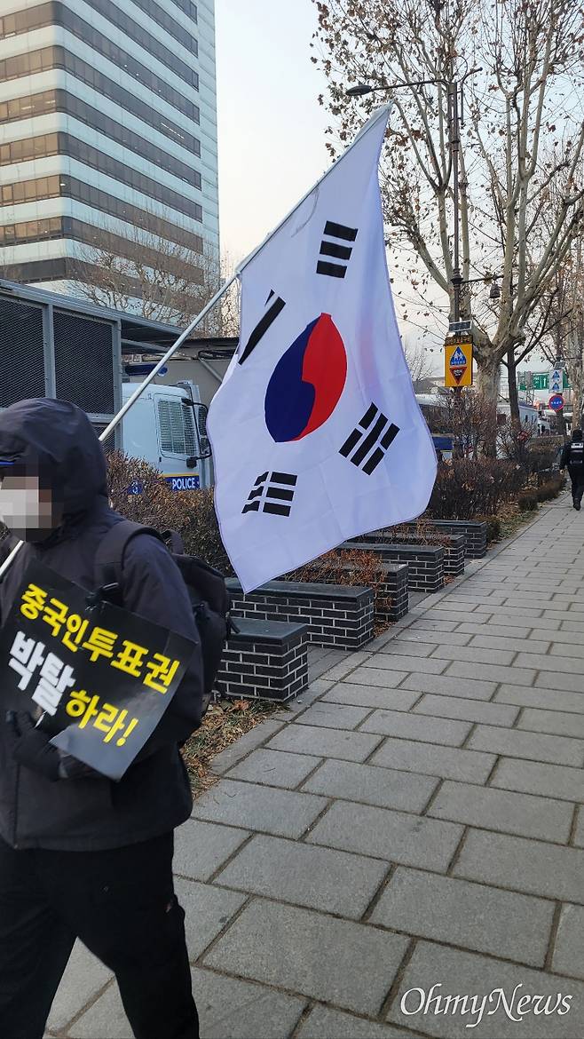 | ▲ 21일 서울 종로구 헌법재판소 앞 극우 시위에서 한 젊은 남성이 '중국인 투표권 박탈하라'는 피켓을 들고 가고 있다. |