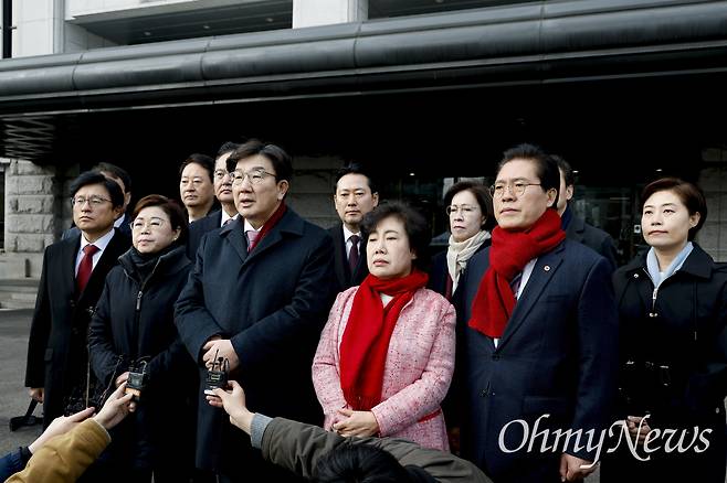 | ▲ 권선동 국민의힘 원내대표, 헌재 항의방문 권성동 국민의힘 원내대표와 국회 법제사법위원회 소속 여당 의원들이 22일 서울 종로구 헌법재판소에서 헌재에 대통령 권한대행 중 탄핵소추된 한덕수 국무총리 심판 사건의 조속한 처리 등을 요구하며 항의하고 있다. |