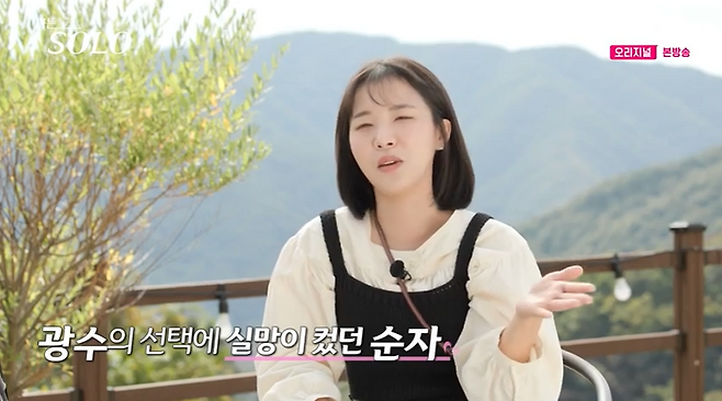 또 순자는 자신을 선택하지 않은 광수를 보고 "저 긍정회로 잘 돌리는 거 같다"며 "지나갔다가 다시 (나한테) 올 줄 알았다"며 웃었다. 이어 "그냥 여러 사람 얘기해 보는 것 중에 하나로, 소위 입 터는 걸로 '첫인상이 너였다'"고 한 거였구나 라며 광수에 대한 실망감을 드러냈다.