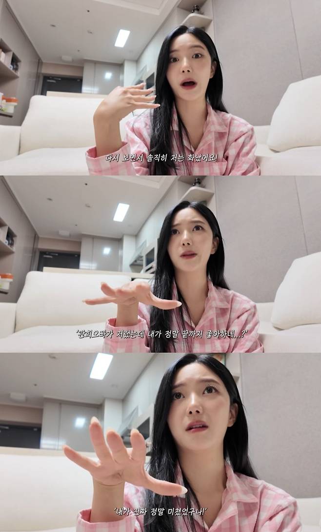 또 자신이 출연했던 '솔로지옥 3'를 봤을 때 "내가 남자한테 저렇게 하나? 큰일났다"고 생각하며 자아성찰의 시간을 가졌다고 회상했다. 이어 "다시 보면서 솔직히 화났다"며 "관희오빠가 저랬는데 내가 끝까지 좋아하네, 내가 미쳤었나"라고 생각했다며 웃었다.