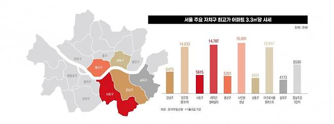 서울에서 가장 아파트값이 비싼 자치구는 강남3구(강남·서초·송파)와 강북 한강변인 용산구, 성동구 등 5개 지역이다. 단위면적당 가격은 강남구와 서초구가 각각 1, 2위를 달리는 가운데 같은 강남권인 송파구와 용산, 성동이 집계 기관에 따라 엎치락뒤치락하고 있다. 한국부동산원에 따르면 1월 6일 기준 강남구의 3.3㎡(평)당 아파트 시세는 6475만원이다.