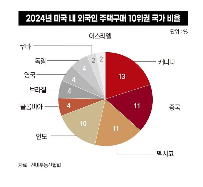 그런데 외국인들의 미국 부동산 투자 규모가 급격히 줄고 있다. 원인은 크게 두 가지로 분석된다. 달러 가치가 상승해 외국인 입장에선 미국 주택가격의 부담이 커졌다. 도널드 트럼프 1기 행정부 당시부터 본격화한 ‘자국 우선주의’와 코로나19 확산으로 인해 중국자본의 투자가 빠지고 있다. NAR에 따르면 중국은 16%를 기록하며 2015년 외국인의 미국 주택 매수 비중 1위를 차지했다. 그러던 것이 2019년부터 11%로 하락하는 등 캐나다에 1위 자리를 내줬다. 2024년 국적별 주택 매수 비중에선 캐나다가 13%로 11%를 기록한 중국과 멕시코를 제쳤다.