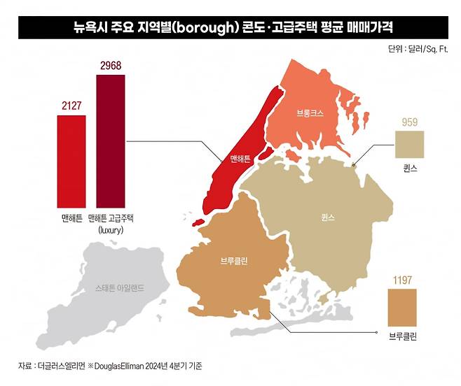 미국 부동산 서비스 업체인 더글러스엘리먼(Douglas Elliman)에 따르면 2024년 4분기 맨해튼 콘도 가격은 1제곱피트(sq. ft.)당 2127달러로 3.3㎡당 약 1억1000만원 정도다. 고급 주택은 3.3㎡당 1억5400만원 수준이다.