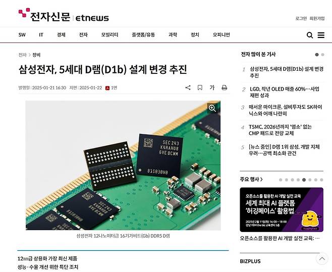 | ▲ 삼성전자가 5세대 D램의 설계 변경을 추진 중이라는 <전자신문>의 보도 |