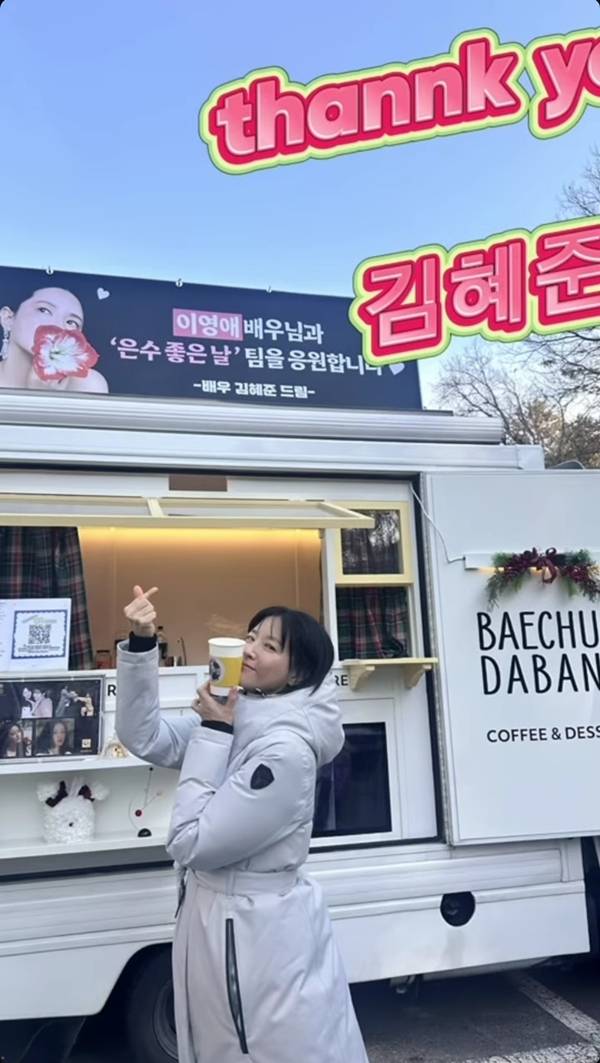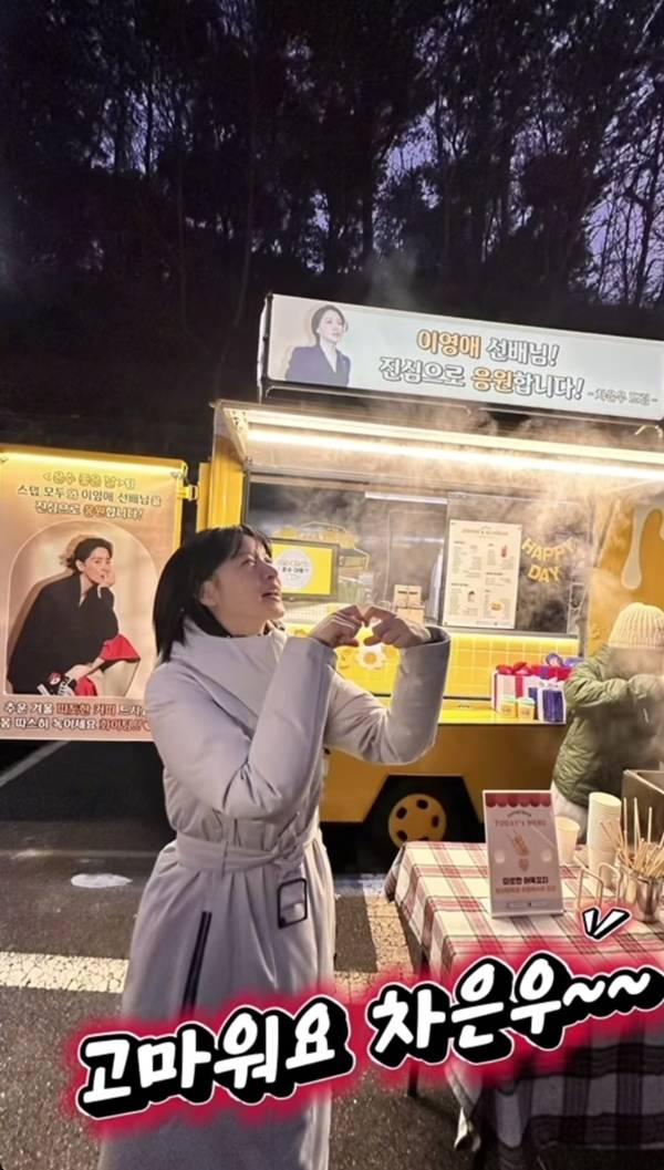 이영애는 23일 자신의 SNS에 “고마워요 차은우, Thank you 김혜준”이라는 글과 함께 사진 여러 장을 게재하며 후배들의 응원에 대한 감사함을 전했다. 사진 속 이영애는 드라마 ‘은수 좋은 날’ 촬영 현장에서 후배들이 보낸 커피차와 함께 밝은 표정을 짓고 있어 눈길을 끌었다.