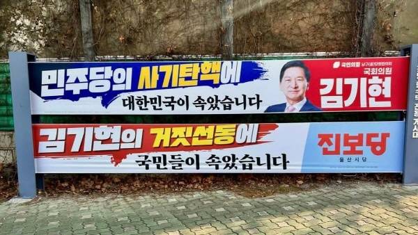 이에 지난 22일 진보당 울산시당이 해당 현수막 바로 위아래에 비슷한 글자배열의 현수막을 나란히 걸었다. 하지만 내용은 정반대였다.