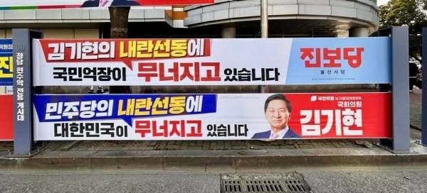 | ▲ 울산 남구에 국민의힘 김기현 의원이 현수막을 걸리자 진보당 울산시당이 이에 반박하는 현수막을 붙였다. |