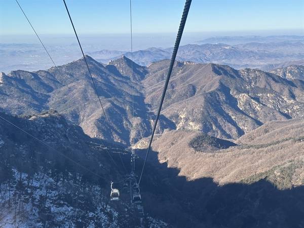 고개를 들어 산 정상 쪽을 올려다보면, 바위로 이루어진 암벽 너머로 높은 산들이 겹겹이 펼쳐진다. 중간에 골짜기에 얼어붙은 얼음폭포도 보이고, 그늘 사이로는 쌓인 눈도 보인다. 남천문 인근 천가참(天街站)에 이르는데 12분 정도 걸린다.