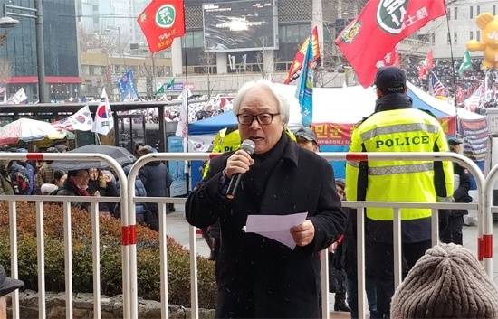| ▲ 박해전 5공 아람회사건 반국가단체 고문조작 국가범죄 청산연대 공동대표가 서울 광화문 KT 앞에서 열린 한 집회에서 국가보안법 철폐의 당위성을 역설하고 있다. |