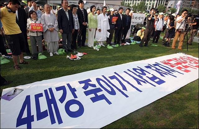 | ▲ 야4당 의원들과 시민들이 2009년 6월 27일 오후 서울 시청광장에서 '4대강 죽이기 사업 저지 범국민 대책위원회'가 주최로 열린 '4대강 생명과 평화를 위한 범국민 한마당'에서 정부의 4대강 정비사업 중단을 요구하며 구호를 외치고 있다. |