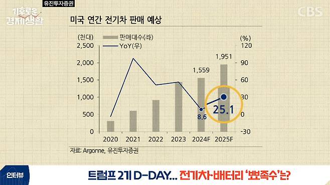 그다음에 테슬라의 또 다른 픽업트럭인 사이버 트럭이, 작년에는 주로 4분기에 많이 팔렸거든요. 올해 판매율은 다 반영되기 때문에 테슬라가 미국에서 올해 15% 성장할 것으로 보고 있어요. 다른 비테슬라의 판매는 작년에도 좋았습니다. 30% 이상 증가했습니다. 올해 GM과 스텔란티스에서 신규로 발매한 차들이 본격적으로 판매되기 때문에 텍스 크레딧이 없어지는 효과를 제외해도 25% 성장을 보고 있어요. 만약에 보조금이 없어지는 효과가 극적으로 나온다면 오히려 증가율이 훨씬 더 올라갈 수 있다고 봅니다.