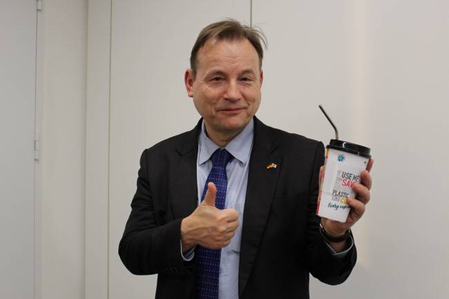 게오르크 빌프리드 슈미트(사진) 주한 독일 대사는 집무실에서 차를 마실 때 사용하는 전용 텀블러가 있다. 이 텀블러 표면에는 유명 브랜드 대신 ‘당신이 하루에 한 번 사용하면 연간 평균 5㎏의 플라스틱과 12㎏의 이산화탄소를 절감할 수 있다’라는 영어 문장이 새겨져 있다. 주한 독일 대사관이 환경 보호 노력의 일환으로 자체 제작한 텀블러다.