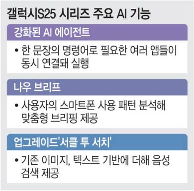 또 갤러리에 있는 사진을 검색할 때 사용자가 날짜·장소 등 키워드를 입력하면 AI가 분석해 키워드에 맞는 사진을 찾아 준다. 사용자의 스마트폰 사용 패턴과 데이터를 분석해 개인화된 맞춤형 정보 브리핑을 제공하는 ‘나우 브리프’ 기능도 추가됐다. ‘서클 투 서치’ 기능도 업그레이드돼 기존의 이미지·텍스트 검색에 더해 기기에서 재생되는 사운드 검색도 지원한다. 이외에도 통화 내용을 글로 옮겨주는 ‘텍스트 변환’, 통화 내용 중 중요한 사항을 간단하게 정리해 주는 ‘통화 요약’을 새롭게 지원한다.
