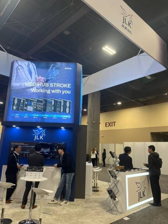 회사는 부스 중앙부를 비롯해 측면에 위치한 대형 화면을 통해 제이엘케이 솔루션을 상시로 확인할 수 있도록 했다. 또 부스 상단에 회사 로고와 QR 코드 등을 배치해 가시성과 접근성을 높였다.