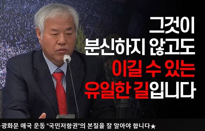 전날 같은 유튜브 채널에 올라온 영상에서도 전 목사는 "분노했던 사람들은 다 광화문 광장으로 뛰어나와야 한다"라며 "그것이 분신 자살하지 않고도 이길 수 있는 유일한 길이다"라고 했다.