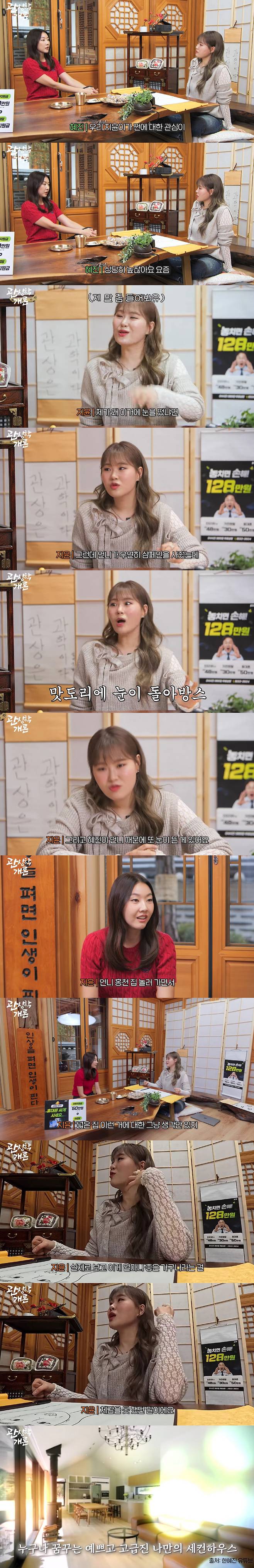 엄지윤은 한혜진 때문에 또 눈에 뜬 게 있다면서 "언니 홍천 집 놀러갔는데, 정원 있고, 마당 있고, 넓은 집 이런 걸 평소에 체감 못 했는데 너무 좋더라. 그리고 언니 집 인테리어 이런 거 보면서 너무 좋아 보이더라"라며 감탄했다.