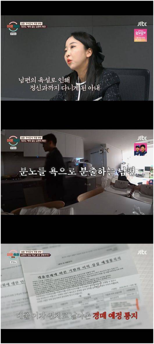 특히 남편 조승환은 거친 욕설과 폭력적인 성향을 드러냈다. 황진주는 “최근에 싸운 건, 남편이 컵라면을 집어 던졌다. 화가 나서 눈앞에 있는 물건을 집어 던진 것 같은데, 카메라가 돌기 시작하고 갑자기 그런 행동을 안 하더라”라면서 기가 막혀 했다.