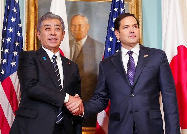 | 루비오 국무장관 만난 이와야 외상 마코 루비오 미국 국무장관(오른쪽)과 이와야 다케시 일본 외상이 21일 워싱턴 국무부 청사에서 악수하고 있다. 도널드 트럼프 2기 행정부 출범 후 처음 열린 미일 외교장관 회담에서 두 사람은 자유롭고 열린 인도태평양을 위해 양국 협력을 강화하기로 합의했다. 아사히신문 제공 |