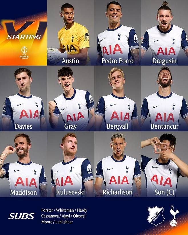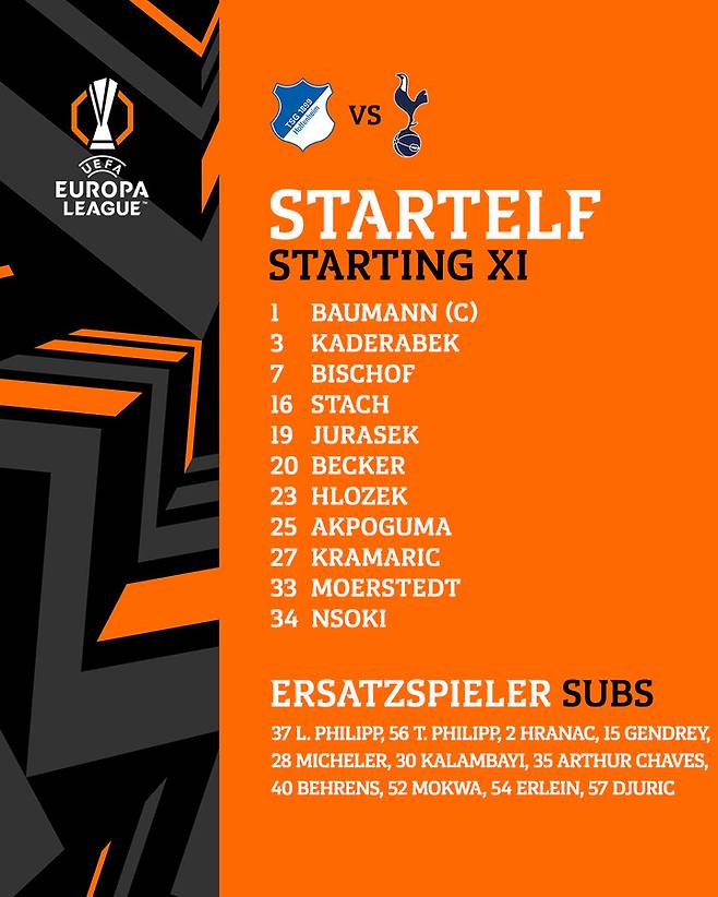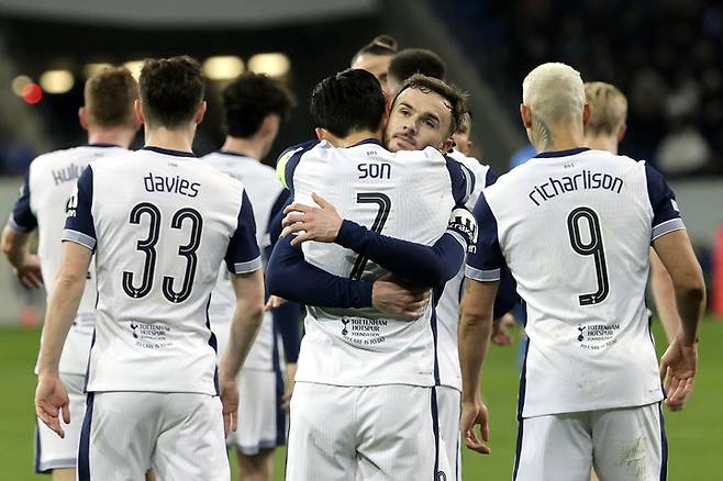토트넘은 24일(한국시간) 독일 진스하임의 라인 레카어 아레나에서 호펜하임(독일)과 2024-2025 유럽축구연맹(UEFA) 유로파리그(UEL) 리그 페이즈 7차전 원정 경기를 치르고 있다.