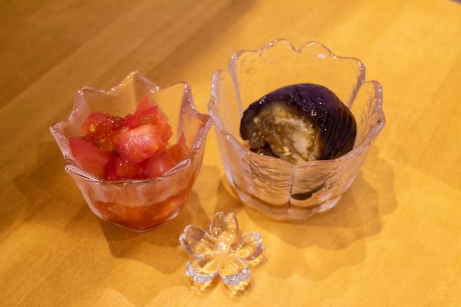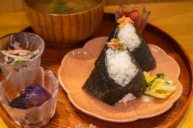 사쿠라 세트는 오니기리 2개(선택 가능), 미소시루(된장국), 반찬 3종이 제공된다. 고슬고슬한 밥, 딱 맞는 간의 속 재료가 어우러져 먹다 보면 어느새 말끔히 비워진 접시만 남는다. 곁들임으로 나온 오독오독한 톳 샐러드와 토마토 샐러드, 동그랗게 말려서 찐 가지도 입맛을 돋운다.