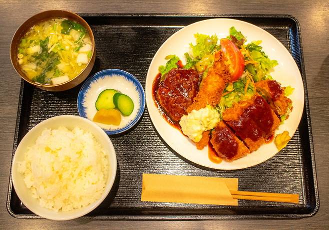 그래서 그럴까. 외국어 메뉴판도 없다. 메뉴판이 흰 종이에 검은 글자처럼 느껴진다면 파파고 앱을 활용해 사진 번역을 이용해 보자. 본격적인 식사 시작. 돈가스, 새우튀김, 함박스테이크 위 농밀한 소스가 담뿍 올라가 있고, 그 아래에서는 아삭하고 신선한 샐러드가 도톰하게 쌓여 있다. 미소시루에는 건더기 가득하다. 팽이버섯이 쫄깃쫄깃, 양파가 아삭아삭 씹혀서 일반 일식집에서 먹는 건더기 없는 미소시루보다 더 숟가락이 자주 간다. 관광지 근처보다 합리적인 가격으로 푸짐한 양과 맛을 모두 갖춘 곳이다.