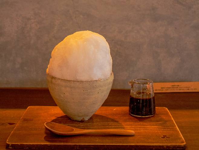차 전문점이다. 그렇다고 차만 파는 건 아니다. 호지 차, 우지 말차 같은 각종 차는 기본, 다과와 구운 떡, 그리고 일명 차빙수(茶氷水)도 판다. 둥그런 언덕처럼 다독다독 쌓은 순 얼음 위에 별도로 나온 차 시럽을 조금씩 골고루 부어 먹으면 된다. 냉침한 차와는 또 다른 매력이다. 일단 시럽이기에 당연히 달콤하고, 차 본연의 향이 선명하게 느껴지는 맛이다. 순전히 얼음과 차 시럽뿐이기에, 평소 토핑이 듬뿍 들어간 빙수를 즐겼다면 입맛에 맞을지는 미지수다.