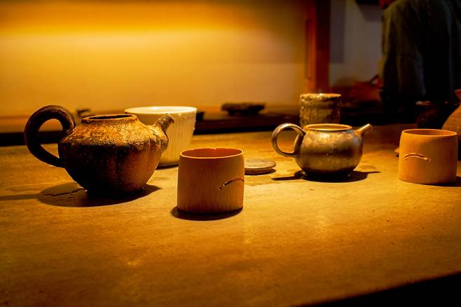 곳곳에 다양한 종류의 다기들도 전시되어 있어 주문한 메뉴를 기다리거나 메뉴를 맛보면서 구경해도 좋다. 바 테이블 안쪽에서는 직원들이 직접 다기를 골라 차를 내리는 모습도 실시간으로 감상할 수 있다. 만들어지는 과정을 보며 메뉴를 즐기니 기쁜 마음으로 기다릴 수 있다.